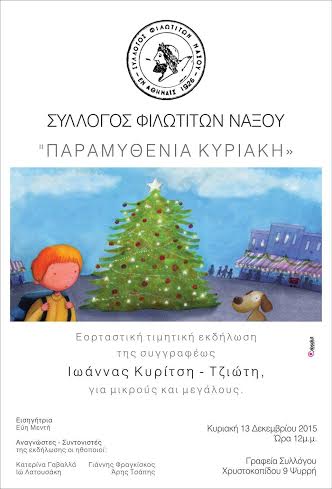 Ο Σύλλογος Φιλωτιτών Νάξου, τιμώντας τη συγγραφέα Ιωάννα Κυρίτση –Τζιώτη, καλεί τους μικρούς και μεγάλους φίλους του, να ζήσουν μια «Παραμυθένια Κυριακή» παρέα με τη συγγραφέα και τα Χριστουγεννιάτικα παραμύθια της, στις 13 Δεκεμβρίου 2015, 12 το μεσημέρι, στα γραφεία του Συλλόγου μας, Χρυστοκοπίδου 9 στου Ψυρρή.