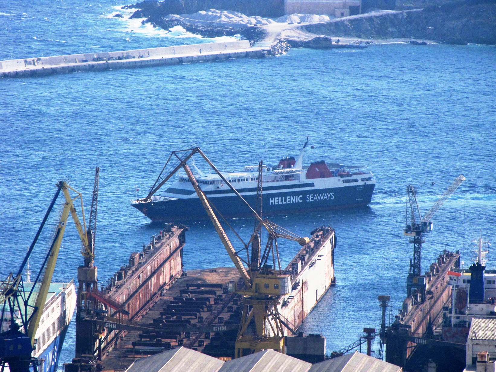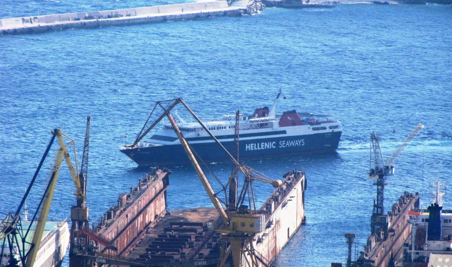 Την Κυριακή το πρωί το πλοίο είχε μεθορμίσει από το επιβατηγό λιμάνι της Σύρου στην προβλήτα του Νεωρίου που βρίσκεται ακριβώς μετά το synchrolift, για να πραγματοποιήσει εργασίες αποκατάστασης του μηχανισμού και των συρματόσχοινων που συγκρατούν τον καταπέλτη του.