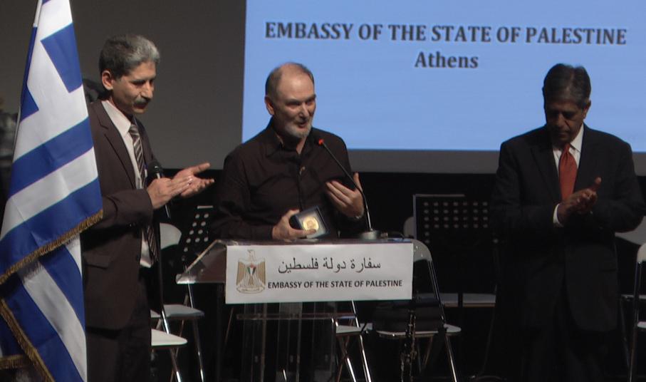 Με μια μαζική και ενθουσιώδη εκδήλωση οι Παλαιστίνιοι της Αθήνας και οι φίλοι τους γιόρτασαν τη ΔΙΕΘΝΗ ΗΜΕΡΑ ΑΛΛΗΛΕΓΓΥΗΣ ΠΡΟΣ ΤΟΝ ΠΑΛΑΙΣΤΙΝΙΑΚΟ ΛΑΟ στο Συνεδριακό Κέντρο ΔΑΙΣ στο Μαρούσι. Την εκδήλωση διοργάνωσε όπως κάθε χρόνο η Πρεσβεία της Παλαιστίνης στην Αθήνα και οι φίλοι του Παλαιστινιακού λαού. Ο πρέσβης της Παλαιστινιακής Αρχής στην Ελλάδα κ. Μαρουάν Εμίλ Τουμπάσι μίλησε στην κεντρική του ομιλία για την αγωνία των Παλαιστινίων για ένα αληθινά ανεξάρτητο, κυρίαρχο Παλαιστινιακό κράτος που θα πορεύεται και θα ευημερεί με ειρήνη και αξιοπρέπεια και θα έχει σχέσεις καλής γειτονίας και συνεργασίας με τους Ισραηλινούς και με όλες τις χώρες της γης. Αναφέρθηκε στις σχέσεις με την Ελλάδα και ευχαρίστησε τους Έλληνες για την υποστήριξή τους προς τον Παλαιστινιακό Λαό και τόνισε ότι αυτές θα ενδυναμωθούν περαιτέρω με την επίσκεψη του κ. Τσίπρα στην Παλαιστίνη και με την επικείμενη επίσκεψη του Προέδρου της Παλαιστίνης κ. Μαχμούτ Αμπάς στην Αθήνα στο τέλος του μήνα. Στην εκδήλωση εκπροσώπησε την Ελληνική Κυβέρνηση ο υπουργός Εσωτερικών και Διοικητικής Ανασυγκρότησης κ. Παναγιώτης Κουρουμπλής, ο οποίος στο χαιρετισμό του μετέφερε την υποστήριξη της Κυβέρνησης στην εδραίωση των κυριαρχικών δικαιωμάτων των Παλαιστινίων. Πριν από την έναρξη των καλλιτεχνικών εκδηλώσεων της βραδιάς ο Παλαιστίνιος Πρέσβης απένειμε τιμητικές διακρίσεις στο ΜΙΚΗ ΘΕΟΔΩΡΑΚΗ, στο ΜΑΝΩΛΗ ΓΛΕΖΟ και στο Συριανό φίλο των Παλαιστινίων ΜΠΑΜΠΗ ΚΟΥΛΟΥΡΑ για τη συμβολή τους στη διεκδίκηση των δικαίων των Παλαιστινίων. Ο ΜΙΚΗΣ ΘΕΟΔΩΡΑΚΗΣ και ο ΜΑΝΩΛΗΣ ΓΛΕΖΟΣ ανακηρύχθηκαν επίτιμοι πολίτες της Παλαιστίνης με απόφαση του ίδιου του Προέδρου ΜΑΧΜΟΥΤ ΑΜΠΑΣ, ενώ στο ΜΠΑΜΠΗ ΚΟΥΛΟΥΡΑ απονεμήθηκε από τον πρέσβη το μετάλλιο τιμής των Παλαιστινίων, που φέρει από τη μια πλευρά την ιστορική στιγμή της ύψωσης της Παλαιστινιακής σημαίας στον ΟΗΕ στις 30 Σεπτεμβρίου 2015 και από την άλλη την υπογραφή του ΜΑΧΜΟΥΤ ΑΜΠΑΣ. Στην απόφαση αναγνώρισης στην ουσία του Παλαιστινιακού κράτους από τη Γενική Συνέλευση του ΟΗΕ ψήφισαν 119 χώρες υπέρ, 8 κατά και 45 απείχαν από την ψηφοφορία. Θετικά ψήφισαν η Ρωσία, Κίνα, Ιταλία, Γαλλία, Ισπανία, Πολωνία, Σουηδία κ.α. και αρνητικά ψήφισαν οι ΗΠΑ, Ισραήλ, Καναδάς, Βουλγαρία κ.α. Ο ΜΑΝΩΛΗΣ ΓΛΕΖΟΣ παραλαμβάνοντας την τιμητική του διάκριση και χαιρετώντας στην εκδήλωση μίλησε για την αναγκαιότητα ύπαρξης ενός ανεξάρτητου Παλαιστινιακού Κράτους και δήλωσε ότι θα αναλωθεί μέχρι το τέλος της ζωής του γι αυτή την υπόθεση , ενώ κάλεσε την Ελληνική Κυβέρνηση ν’ αναγνωρίσει την ΠΑΛΑΙΣΤΙΝΗ επίσημα, πράγμα που δεν έχει κάνει μέχρι σήμερα και επιμερίσθηκε και το δικό του μερίδιο ευθύνης γι αυτό. Ο εκπρόσωπος του ΜΙΚΗ ΘΕΟΔΩΡΑΚΗ, ο οποίος δεν παραβρέθηκε για λόγους υγείας, παρέλαβε την τιμητική διάκριση και διάβασε μήνυμα του σπουδαίου μουσικοσυνθέτη και αντιστασιακού, όπου δήλωνε την αγωνία του για τη στερέωση της Ειρήνης στη μέση Ανατολή και τη σταθερή του αγωνιστική θέση στα δίκαια των Παλαιστινίων. Ο Παλαιστίνιος πρέσβης παρέδωσε το τιμητικό μετάλλιο στο ΜΠΑΜΠΗ ΚΟΥΛΟΥΡΑ ο οποίος συγκινημένος είπε ότι αισθάνεται υπερηφάνεια και συγκίνηση να τιμάται αυτή τη μέρα από τον υπερήφανο Παλαιστινιακό Λαό και δέος γιατί τιμάται την ίδια ιστορική μέρα με τους δύο εμβληματικούς γίγαντες της Πατρίδας μας. Δήλωσε δε, ότι με τις ταπεινές του δυνάμεις θα συνεχίσει 