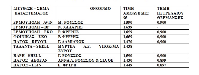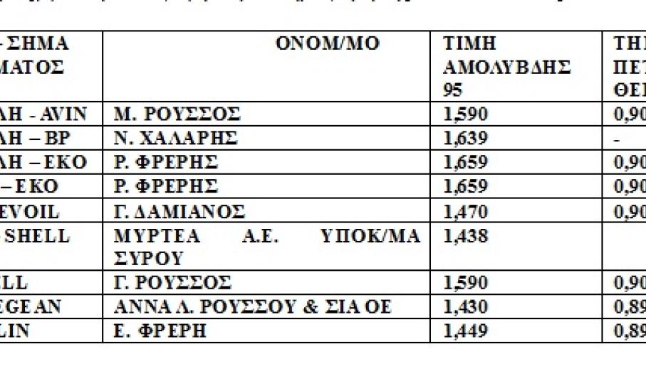 To Τμήμα Εμπορίου Κυκλάδων ενημερώνει για τις τιμές πώλησης της αμόλυβδης βενζίνης που διατίθεται από τα πρατήρια υγρών καυσίμων της Σύρου για τις 14.12.2015. Αναλυτικά οι τιμές προβάλλονται στον πίνακα.