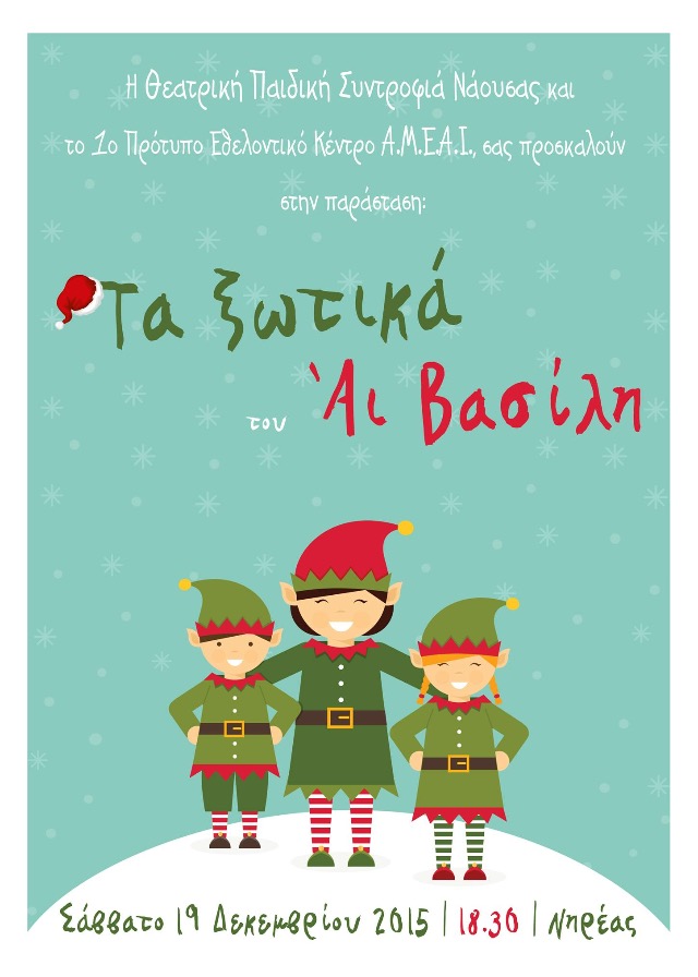 Το εορταστικό "παρών" δίνει και φέτος τα Χριστούγεννα ο Χορευτικός Όμιλος Νάουσας, αρχής γενομένης με τη θεατρική παράσταση "Τα ξωτικά των Χριστουγέννων", σε μια συνεργασία της Θεατρικής Παιδικής Συντροφιάς Νάουσας και του 1ου Πρότυπου Εθελοντικού Κέντρου Α.Μ.Ε.Α.Ι. Η παράσταση θα δοθεί το Σάββατο 19 Δεκεμβρίου 2015, στις 18:30, στην αίθουσα του Νηρέα, στη Νάουσα, με τη συμμετοχή και των παιδιών του Κέντρου. Τιμή εισιτηρίου 3 ευρώ.