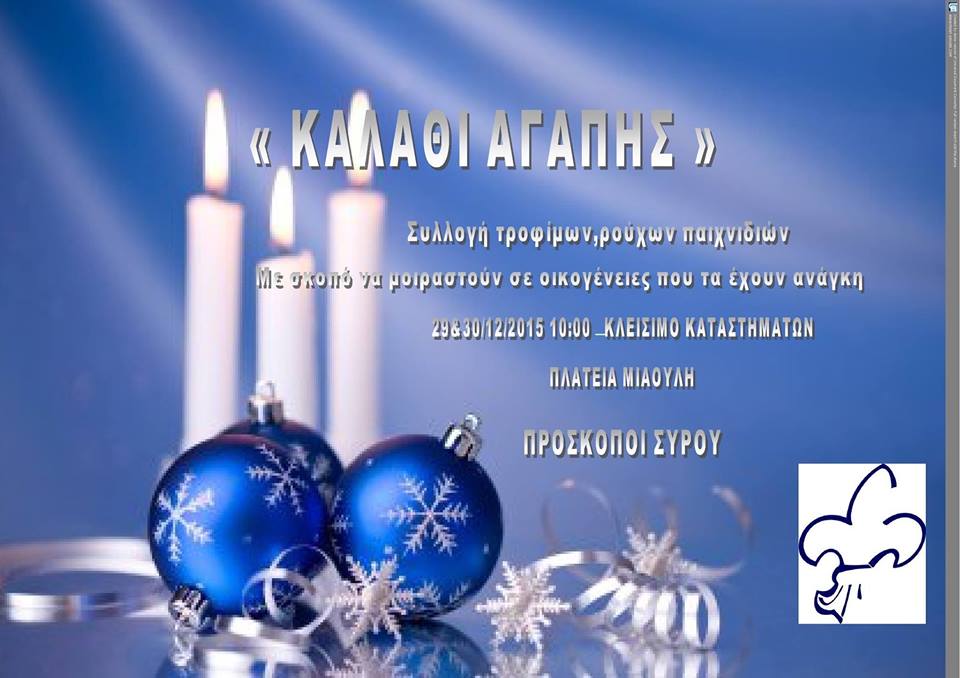 Το Σώμα Ελλήνων Προσκόπων προσκαλεί την κοινωνία της Σύρου στις 29 και 30 Δεκεμβρίου στην Πλατεία Μιαούλη να προσφέρει ό,τι μπορεί, από τρόφιμα μέχρι ρούχα και παιχνίδια, τα οποία θα διατεθούν σε οικογένειες του νησιού που έχουν ανάγκη τη βοήθειά μας.