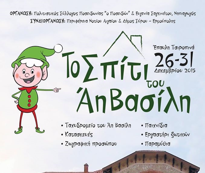 Στο ζεστό και φιλόξενο σπίτι του Άη Βασίλη στην Έπαυλη Τσιροπινά στην Ποσειδωνία, ο αγαπημένος Άγιος των παιδιών θα υποδεχτεί μικρούς και μεγάλους από 26 έως 31 Δεκεμβρίου 2015 για να γιορτάσουν παρέα τον ερχομό της καινούριας χρονιάς.