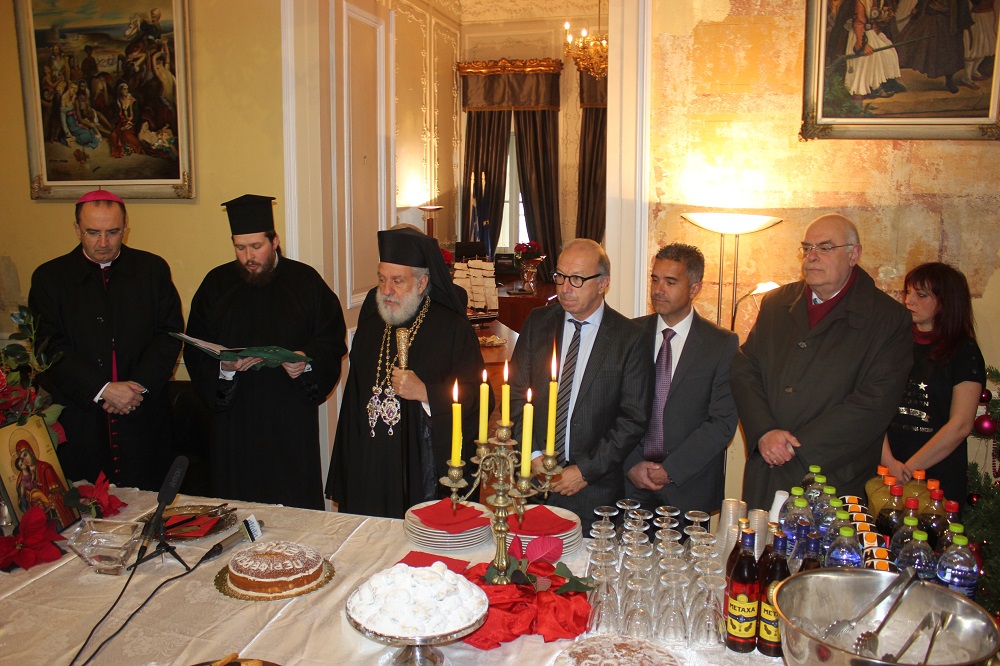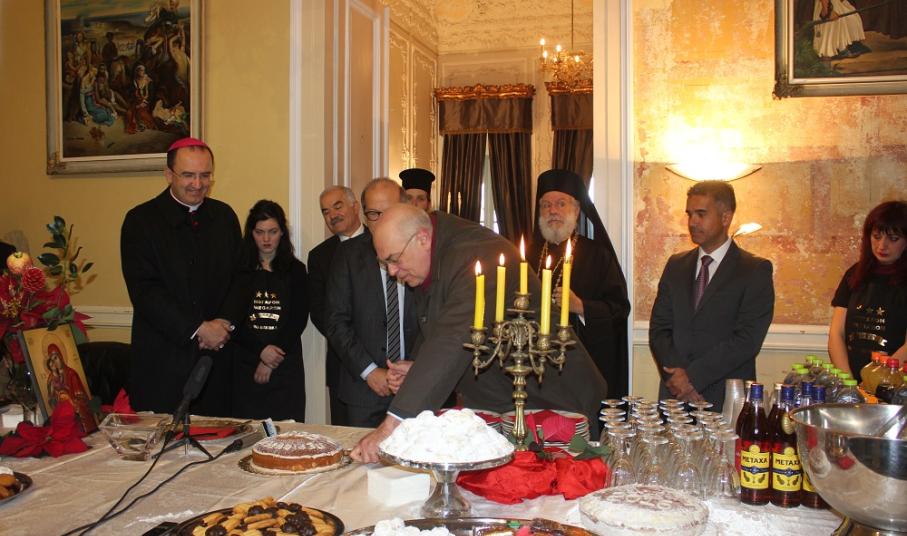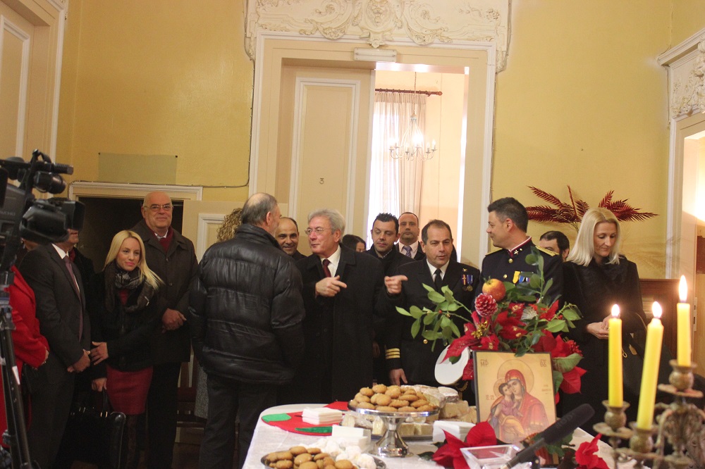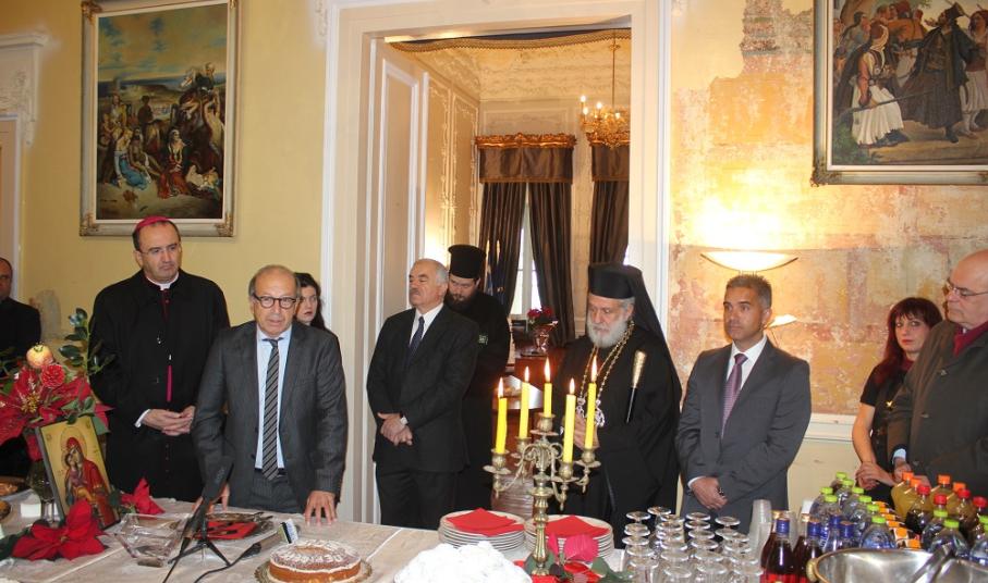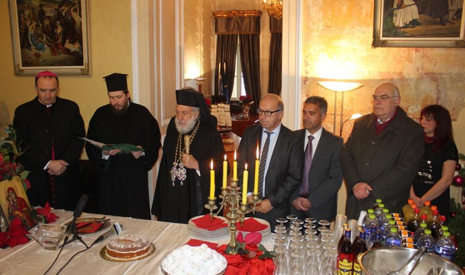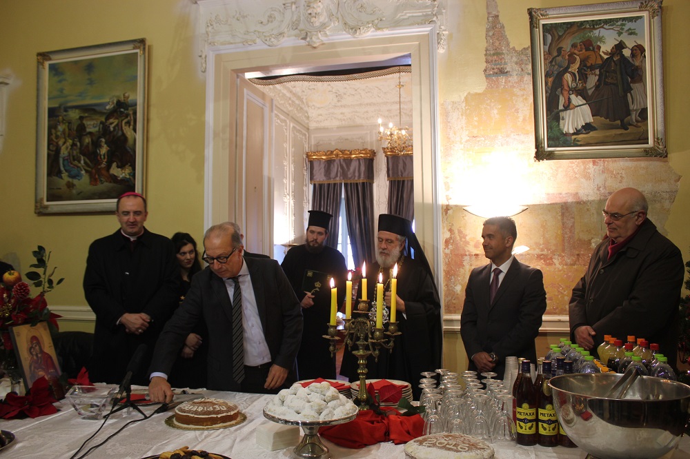 Αμέσως μετά την καθιερωμένη Δοξολογία στον Ιερό Ναό του Αγίου Νικολάου την Πρωτοχρονιά, ο Σεβασμιώτατος Μητροπολίτης Σύρου, κ. Δωρόθεος Β΄, ο Καθολικός Επίσκοπος Σύρου, Σεβ. π. Πέτρος Στεφάνου αλλά και το σύνολο των εκπροσώπων των Τοπικών Αρχών καθώς επίσης και μέλη των Σωμάτων Ασφαλείας μετέβησαν στο ιστορικό κτίριο της Περιφέρειας Νοτίου Αιγαίου, στην πλατεία Τσιροπινά στην Ερμούπολη προκειμένου να χαιρετίσουν την αυγή του νέου χρόνου και να στείλουν μήνυμα ενότητας, συνεργασίας και πολιτική ωρίμανσης, εφόδια που ζητά επιτακτικά σήμερα η οικονομική και κοινωνική πραγματικότητα.