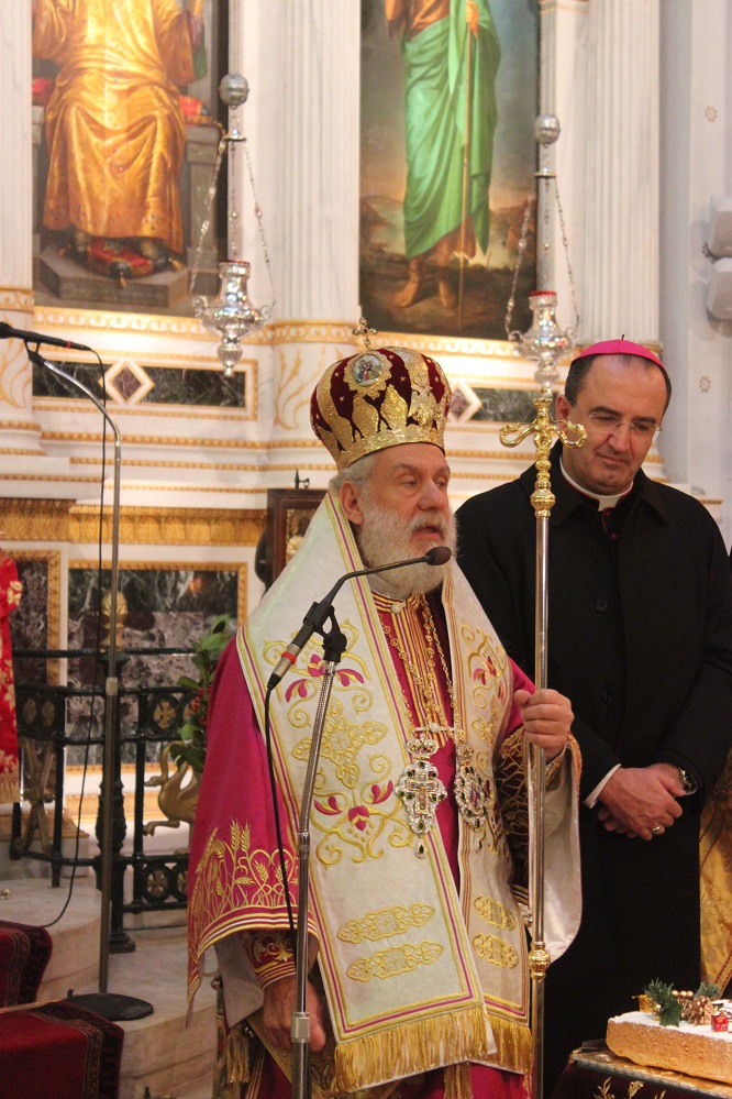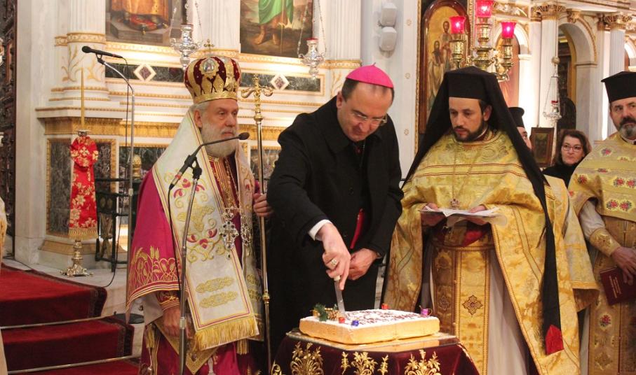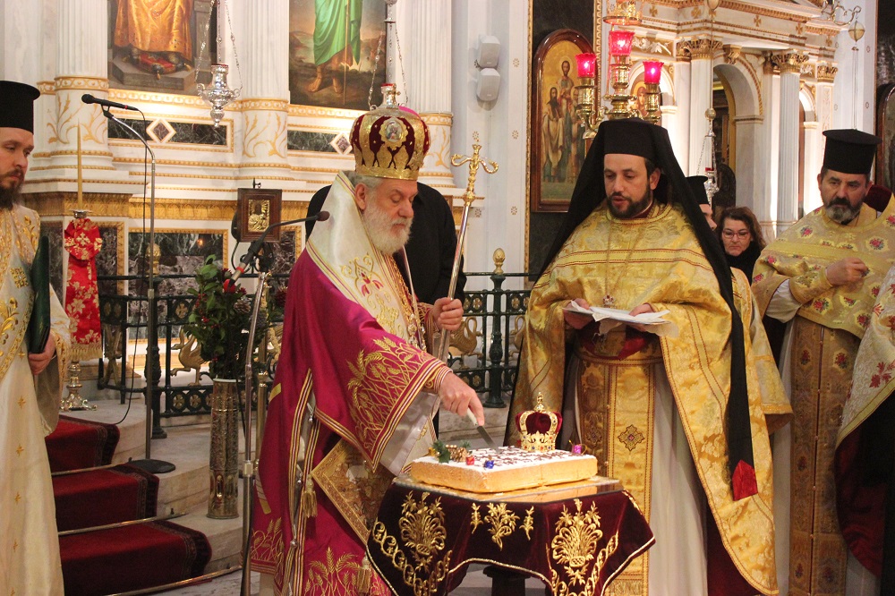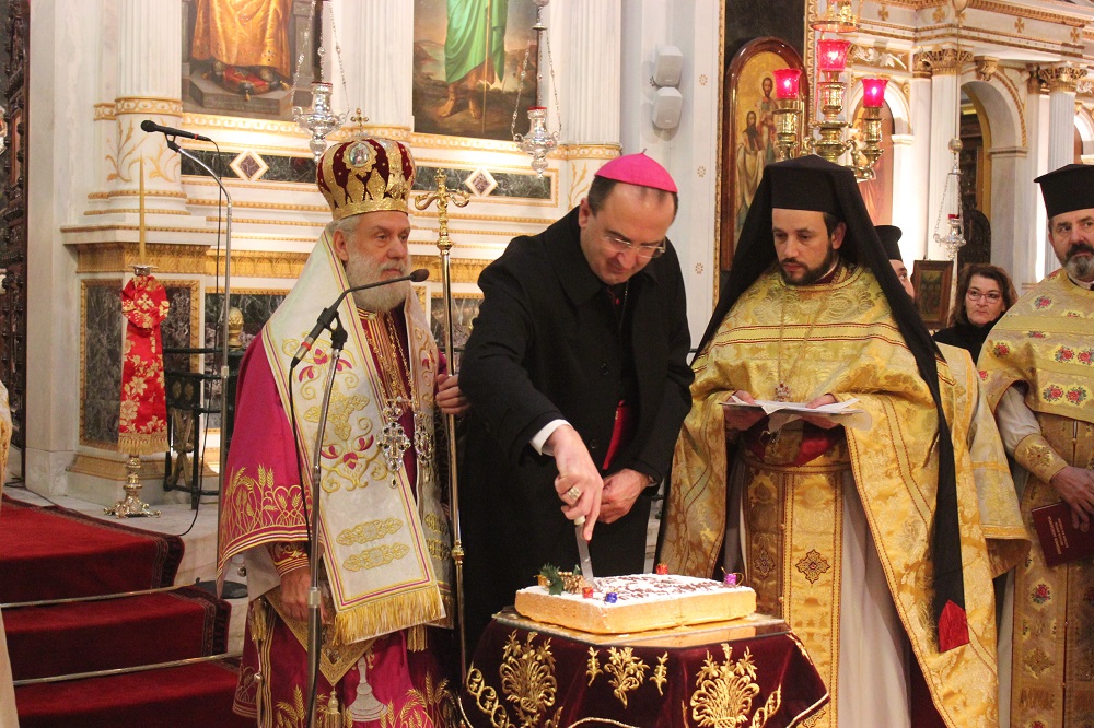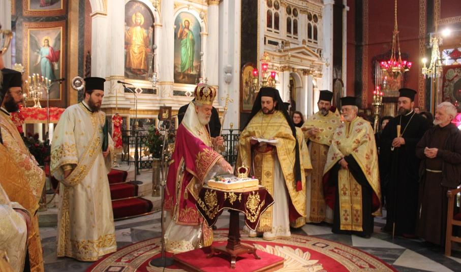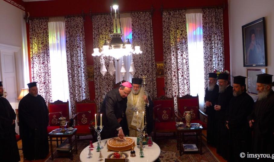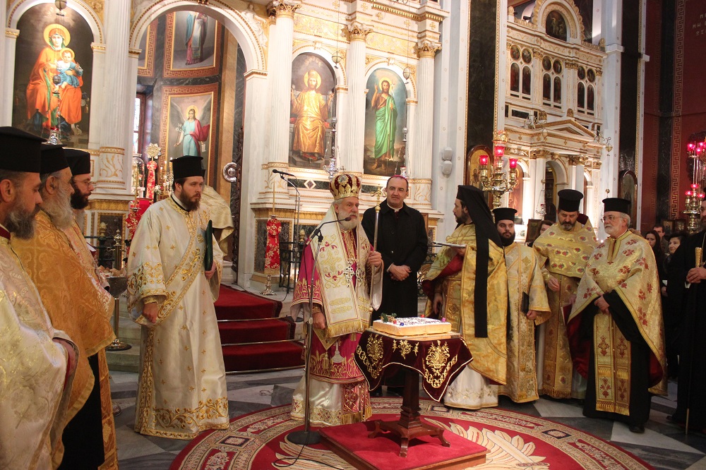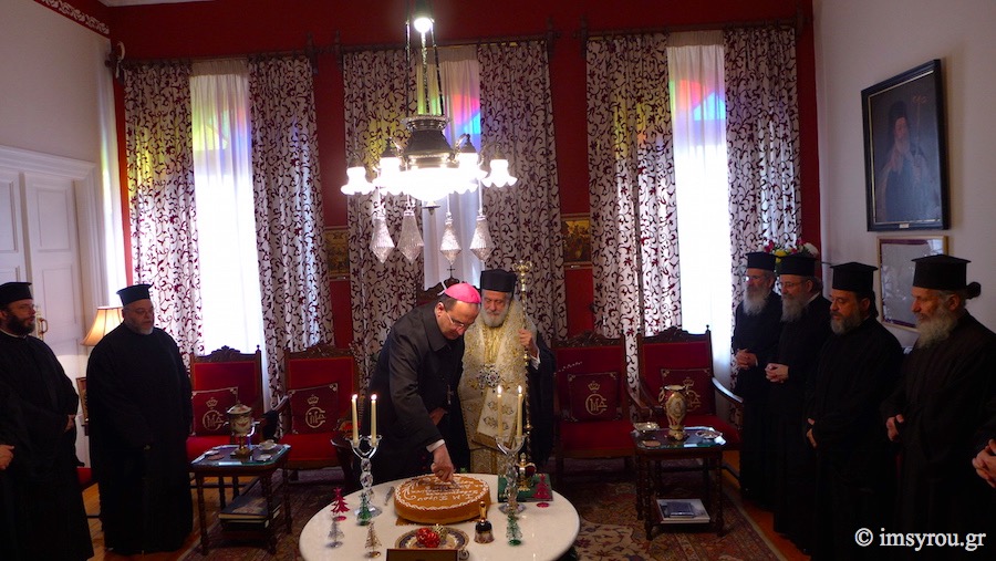 Παρουσία του Καθολικού Επισκόπου Σύρου, Σεβ. π. Πέτρου Στεφάνου, του βουλευτή Κυκλάδων, Αντώνη Συρίγου, του αντιπεριφερειάρχη Κυκλάδων, Γιώργου Λεονταρίτη, του δημάρχου Σύρου - Ερμούπολης, Γιώργου Μαραγκού καθώς και αιρετών προσώπων αλλά κι εκπροσώπων φορέων, Συλλόγων και των Σωμάτων Ασφαλείας, ο κκ.Δωρόθεος Β΄ευλόγησε κι έκοψε την Αγιοβασιλιάτικη πίτα του πολιούχου ναού της Σύρου, απευθύνοντας θερμούς λόγους προς το σύνολο των πιστών της Ιεράς Μητρόπολης Σύρου αλλά και τους ιερείς που επιτελούν συνετά το έργο τους στα δώδεκα νησιά της Μητρόπολης.