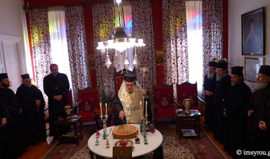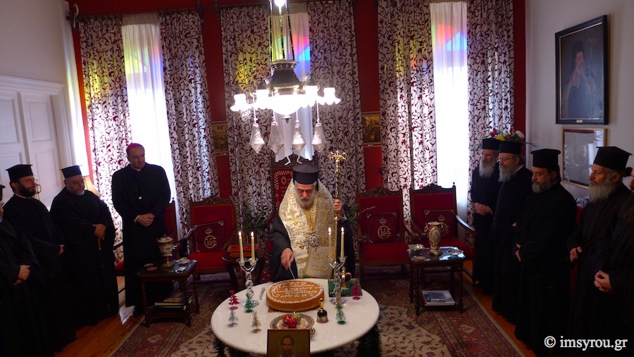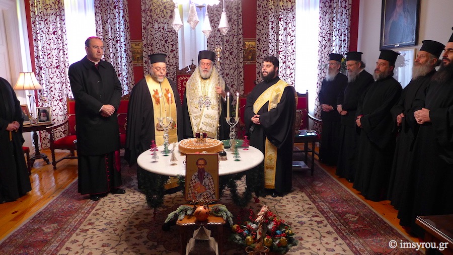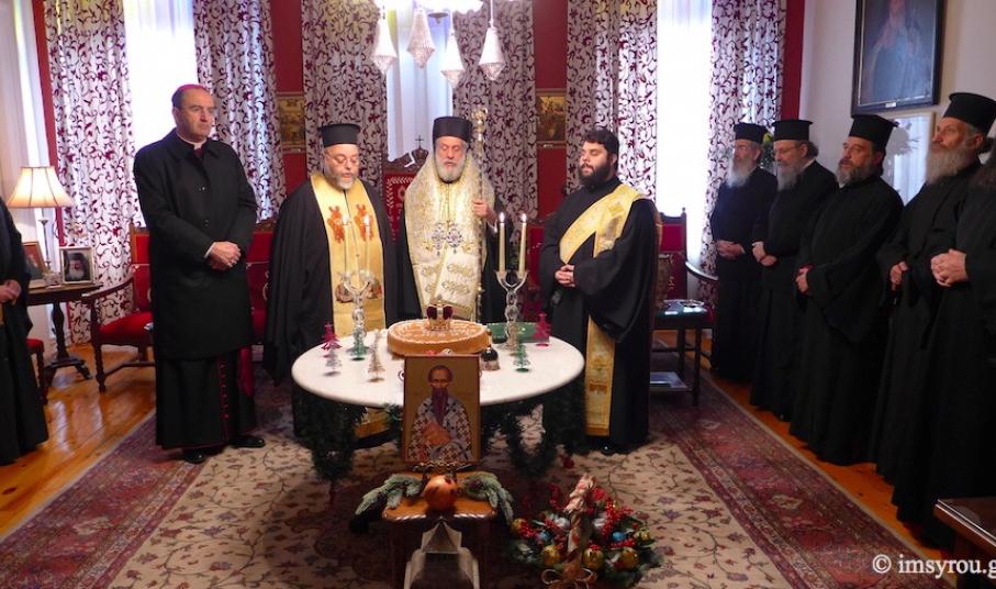 Το μεσημέρι, στην αίθουσα του Θρόνου, στο Επισκοπείο Ερμουπόλεως, ο Σεβασμιώτατος κ. Δωρόθεος Β' , παρουσία όλων των Εφημερίων της Σύρου, μελών των οικογενειών τους και του Καθολικού Επισκόπου Σύρου Σεβ. π. Πέτρου Στεφάνου ευλόγησε την Αγιοβασιλειόπιττα της Ιεράς Μητροπόλεως και ευχήθηκε πρός όλους τους Ιερείς που διακονούν τα ιερά Θυσιαστήρια των 12 νησιών να συνεχίσουν το θεάρεστο έργο τους. Επιπλέον, ευχαρίστησε τα μοναχικά Τάγματα, γιατί διατηρούν τις Μονές σε αρίστη κατάσταση και τις έχουν καταστήσει λιμάνια ψυχών, όπου αναπαύονται κουρασμένες ψυχές ανθρώπων, όχι μόνο από τα νησιά, αλλά και από όλη την Ελλάδα.