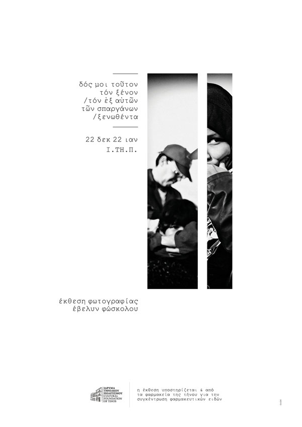 Χριστούγεννα, και το Ίδρυμα Τηνιακού Πολιτισμού εκθέτει στο μέγαρό του τις ασπρόμαυρες αυτές φωτογραφίες της Τηνίας φωτογράφου, τραβηγμένες στην Λέσβο και την Ειδομένη, εκεί που γίνεται η διάβαση, εκεί που δοκιμάζεται η ανθρωπιά μας, εκεί που παίρνει σάρκα ο εσχατολογικός λόγος του Θεανθρώπου «ήμουν ξένος και…» καλώντας μας να συμπληρώσουμε στη συνέχεια την θεάρεστη προσφορά φιλοξενίας.