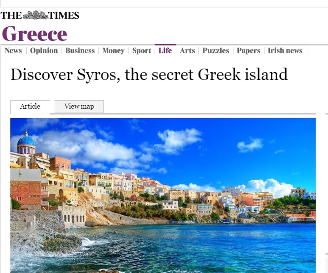 Η Σύρος πρωταγωνιστεί σε ένα εκτενές αφιέρωμα της βρετανικής ημερήσιας εφημερίδας "The Times" με τίτλο "Discover Syros, the secret Greek island" στο περιεχόμενο του οποίου γίνεται αναλυτική παρουσίαση των όμορφων "μυστικών" της πρωτεύουσας των Κυκλάδων.