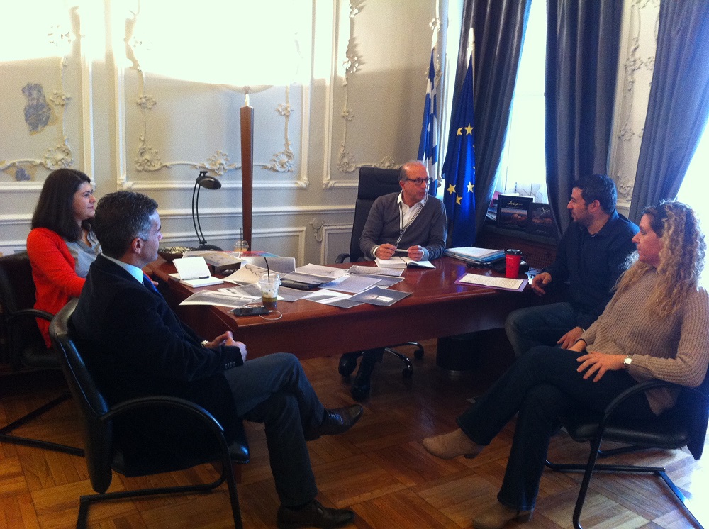 Συνάντηση εργασίας με τον Δήμαρχο Σύρου – Ερμούπολης κ. Γεώργιο Μαραγκό, την Πρόεδρο του Δημοτικού Συμβουλίου κα Μαρία Καζαντζάκη, τον Πρόεδρο της Δημοτικής Επιτροπής Παιδείας κ. Φραγκίσκο Βακόνδιο και την Πρόεδρο της Πρωτοβάθμιας Σχολικής Επιτροπής κα Ειρήνη Μαραγκού είχε σήμερα στο γραφείο του ο Αντιπεριφερειάρχης Κυκλάδων κ. Γεώργιος Λεονταρίτης με θέμα την προγραμματική σύμβαση που πρόκειται να συνάψει η Περιφέρεια Νοτίου Αιγαίου με τον Δήμο Σύρου – Ερμούπολης για την υλοποίηση του έργου επισκευαστικών εργασιών των σχολικών μονάδων του νησιού.