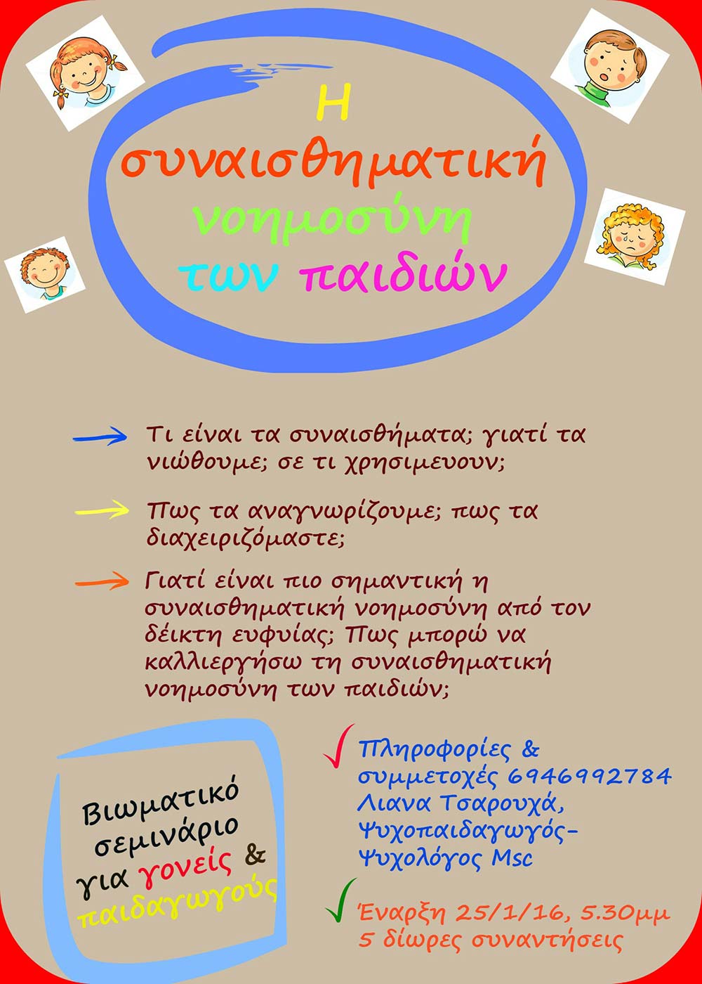 Το σεμινάριο απευθύνεται σε γονείς, εκπαιδευτικούς, παιδαγωγούς και οποιονδήποτε καθοδηγεί ομάδες παιδιών.Έχει διάρκεια 5 δίωρες συναντήσεις (1 ανά 15ήμερο) και θα πραγματοποιηθεί στην αίθουσα Δελασάλ του ιδ. Σχολείο Άγιος Γεώργιος. Έναρξη την Δευτέρα 25/1/2016 στις 17.30.
