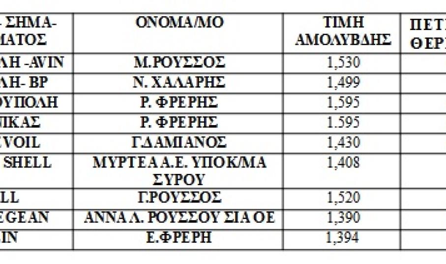 Τις τιμές πώλησης της αμόλυβδης βενζίνης που διατίθεται από τα πρατήρια υγρών καυσίμων Σύρου σήμερα 26 Ιανουαρίου 2016 δημοσιεύει το Τμήμα Εμπορίου της Διεύθυνσης Ανάπτυξης Κυκλάδων.