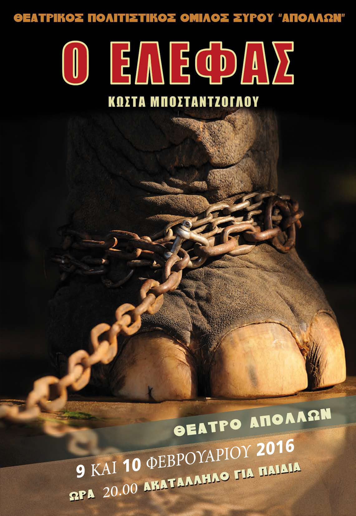 Ο Θεατρικός Πολιτιστικός Όμιλος Σύρου «Απόλλων» παρουσιάζει το έργο «Ο Ελέφας» του Κώστα Μποσταντζόγλου την Τρίτη 9 & Τετάρτη 10 Φεβρουαρίου 2016, στο Θέατρο Απόλλων και ώρα 20:00, με τιμή εισιτηρίου 5 ευρώ.
