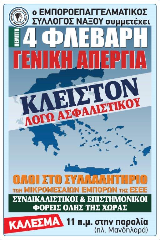 Ο Εμποροεπαγγελματικός Σύλλογος Νάξου ενημερώνει πως συμμετέχει στην Γενική Απεργία της 4ης Φεβρουαρίου, καλώντας την τοπική κοινωνία στο Συλλαλητήριο των μικρομεσαίων εμπόρων της ΕΣΕΕ, που θα πραγματοποιηθεί στις 11 το πρωί της Πέμπτης, στην παραλία (Πλατεία Μανδηλαρά).