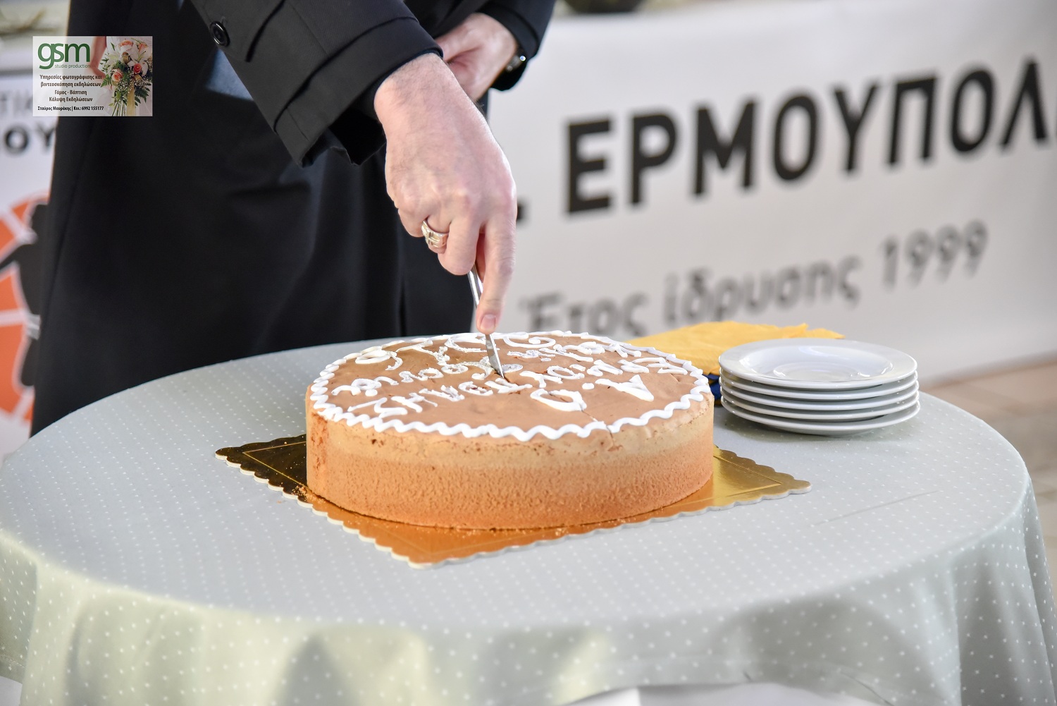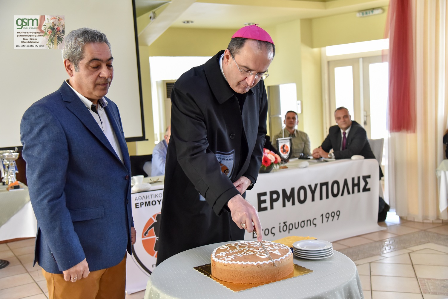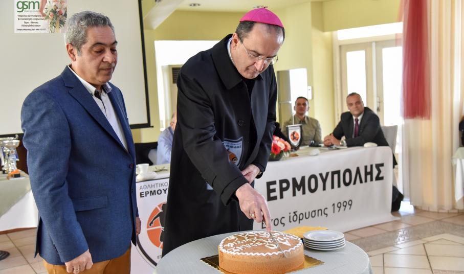 Σε μία κατάμεστη αίθουσα από παιδιά, γονείς και... τρόπαια πραγματοποιήθηκε η καθιερωμένη κοπή της πρωτοχρονιάτικης πίτας της ομάδας μπάσκετ του Α.Ο. Ερμούπολης. Η εκδήλωση πραγματοποιήθηκε σε αίθουσα του ξενοδοχείο "Ερμής" κι εκτός από τους γονείς και τους αθλητές το "παρών" τοπικοί φορείς του τόπου, αλλά και ο σεβασμιότατος της καθολικής εκκλησίας πατέρας Πέτρος Στεφάνου.