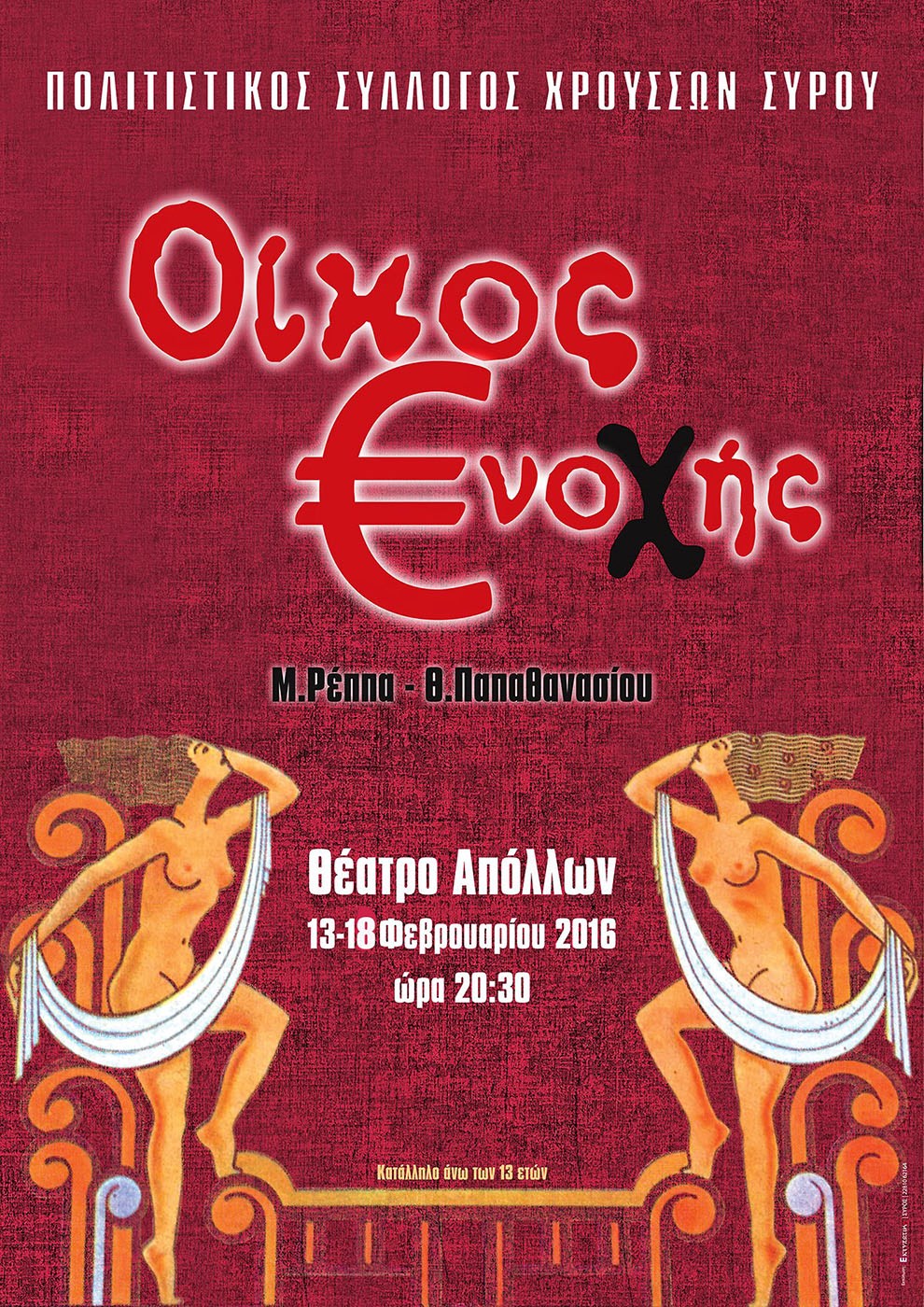 Την ξεκαρδιστικά επίκαιρη φαρσοκωμωδία των Μιχάλη Ρέππα – Θανάση Παπαθανασίου «Όικος Ενοχής» (πρωτ. τίτλος: Ράους) με πρωταγωνίστρια την οικονομική κρίση που ταλανίζει τη χώρα μας, παρουσιάζει τις επόμενες ημέρες στο Θέατρο «Απόλλων», ο Πολιτιστικός Σύλλογος Χρούσσων Σύρου.