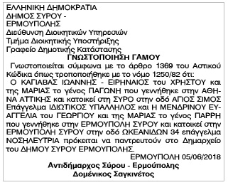 Γνωστοποίηση Γάμου Καγιαβά Ιωάννη - Ειρηναίου και Μενδρινού Ευαγγελίας