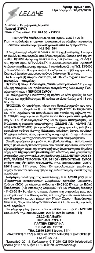 Περίληψη Ανακοίνωσης υπ' αριθ. ΣΟΧ 1/2018