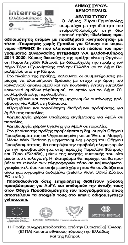 Δελτίο Τύπου Δήμου Σύρου Ερμούπολης Interreg Ελλάδα - Κύπρος