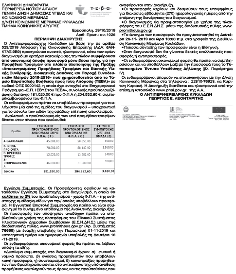 Προμήθεια τροφίμων της Διεύθυνσης Κοινωνικής Μέριμνας Κυκλάδων