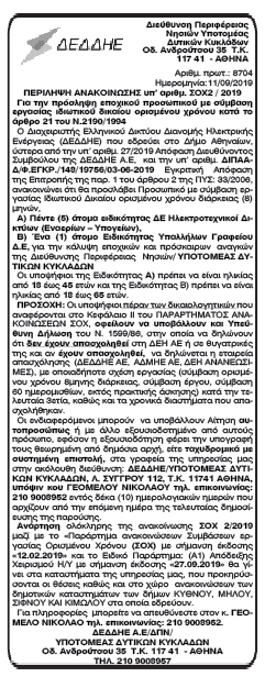 Περίληψη ανακοίνωσης υπ' αριθμ. ΣΟΧ 2/2019 για την πρόσληψη εποχικού προσωπικού της ΔΕΔΔΗΕ