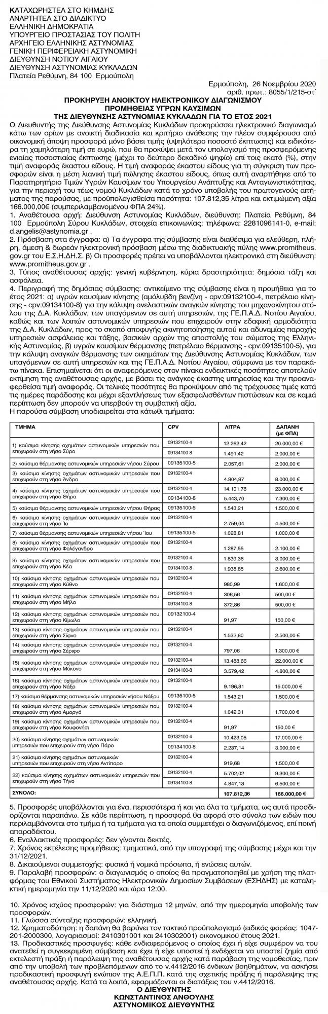 Προμήθεια υγρών καυσίμων της Διεύθυνσης Αστυνομίας Κυκλάδων για το έτος 2021