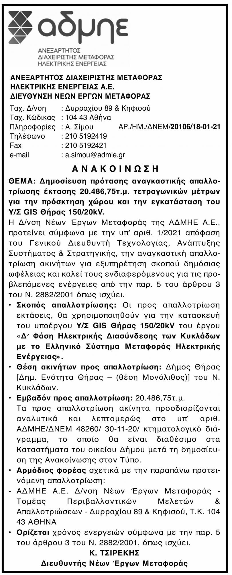 Πρόταση αναγκαστικής απαλλοτρίωσης της ΑΔΜΗΕ