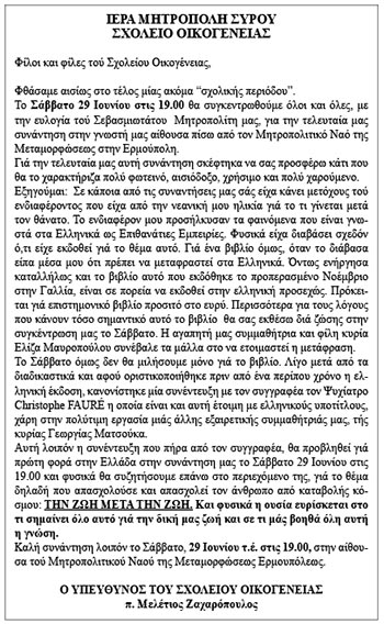 Ανακοίνωση λήξεως Σχολείου οικογένειας Μητροπόλεως Σύρου, Ιούνιος 2024