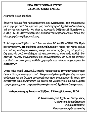 Ανακοίνωση έναρξης Σχολείου Οικογένειας Μητροπόλεως Σύρου, 23 Νοεμβρίου 2024