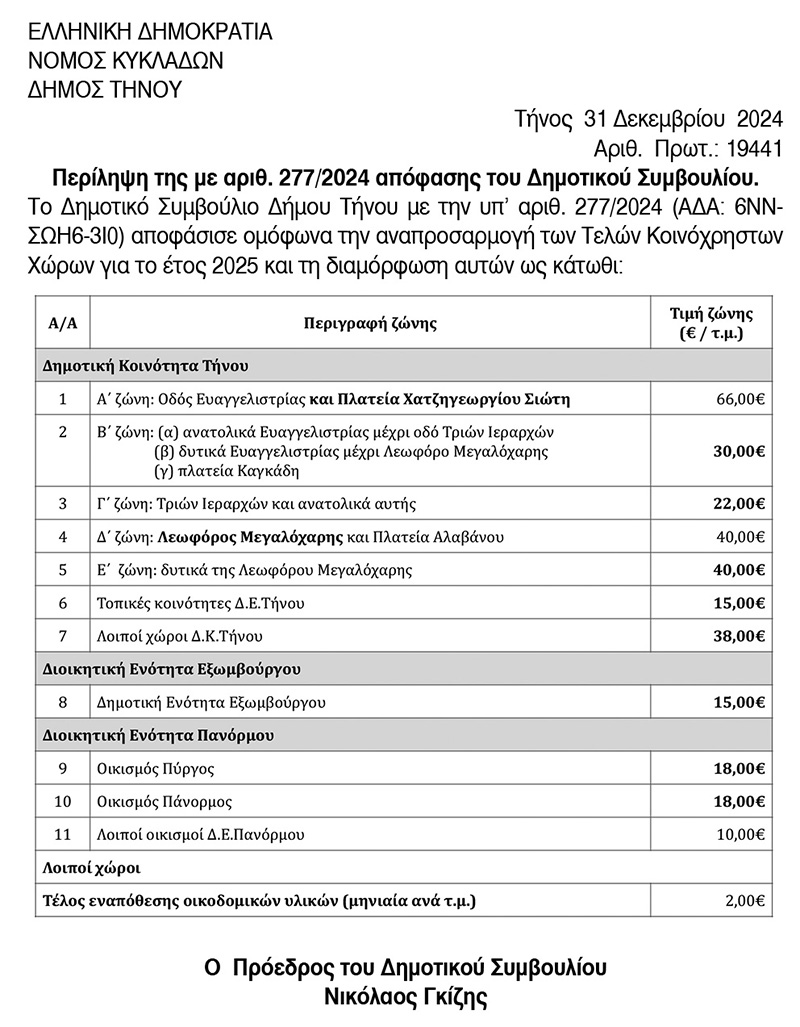 Αναπροσαρμογή τελών κοινόχρηστων χώρων για το έτος 2025, από το Δήμο Τήνου