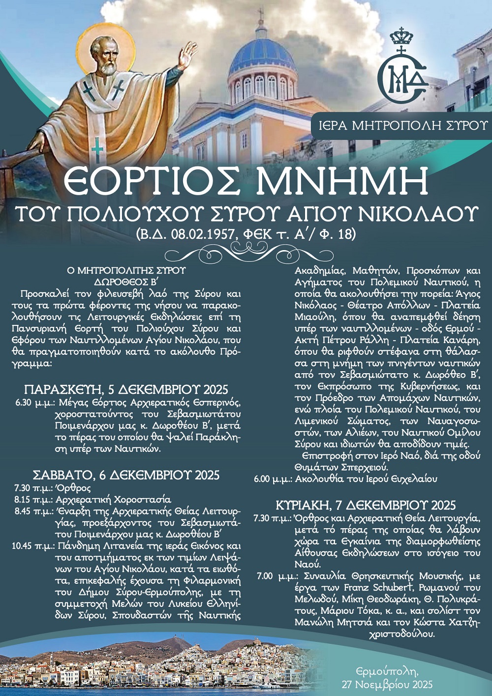 Πρόγραμμα εορτής αγίου Νικολάου 2025, από την Ιερά Μητρόπολη Σύρου
