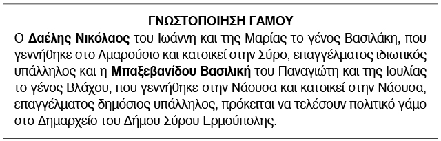 Γνωστοποίηση γάμου για Δαέλη Νικόλαο και Μπαξεβανίδου Βασιλική