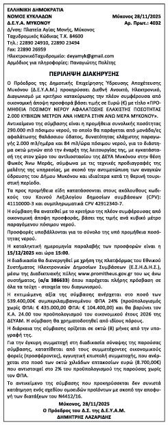 Προμήθεια πόσιμου νερού αφαλάτωσης ελάχιστης ποσότητας 2.000 κυβικών μέτρων ανά ημέρα στην Άνω Μερά Μυκόνου Τρίτη, 02 Δεκεμβρίου 2025 - 3:36 μμ Πελάτης: ΕΛΜΑ Κατηγορία: Προκήρυξη Έργων - Δημοπρασίες Αριθμός Φύλλου: 6739
