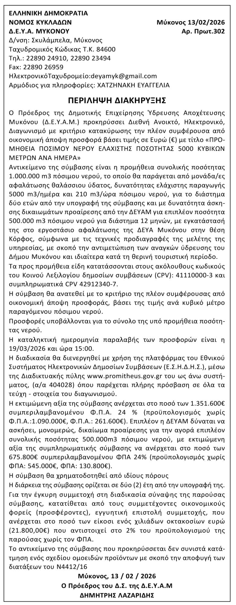 Προμήθεια πόσιμου νερού ελάχιστης ποσότητας 5000 κυβικών μέτρων ανά ημέρα, από Δ.Ε.Υ.Α. Μυκόνου Δευτέρα, 02 Μαρτίου 2026 - 1:53 μμ Πελάτης: ΕΛΜΑ Κατηγορία: Προκήρυξη Έργων - Δημοπρασίες Αριθμός Φύλλου: 6796
