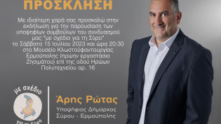 Ο υποψήφιος Δήμαρχος Σύρου-Ερμούπολης, Άρης Ρώτας, καλεί τους κατοίκους του Φοίνικα σε συνάντηση, την Παρασκευή 22/09/2023 στο κατάστημα του “Σουσουρί...