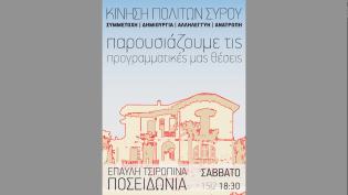 Το Σάββατο 15 Φεβρουαρίου πρόκειται να ανακοινώσει επίσημα τις προγραμματικές θέσεις του ο νέος συνδυασμός "Κίνηση Πολιτών για τη Σύρο" στις 18.30 το ...