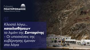 Αναφορικά με το πρόσφατο κλείσιμο του λιμανιού της Σαντορίνης, λόγω κατολισθήσεων, ο τομεάρχης Νησιωτικής Πολιτικής του ΠΑΣΟΚ, Γιάννης Πολυχρονάκος, έ...
