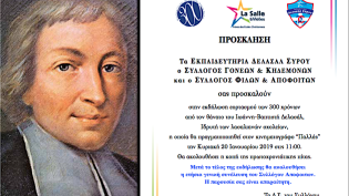 Τα Εκπαιδευτήρια Δελασάλ Σύρου, ο Σύλλογος Γονέων & Κηδεμόνων και ο Σύλλογος Φίλων & Αποφοίτων σας προσκαλούν στην εκδήλωση εορτασμού των 300 χρόνων α...