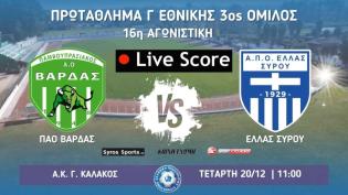 Παρακολουθείστε την εξέλιξη του αγώνα λεπτό προς λεπτό της Ελλάς Σύρου στο γήπεδο ΑΚ. Γ. Καλάκος στη Βάρδα. Το παιχνίδι είναι στο πλαίσιο της 16ης αγω...