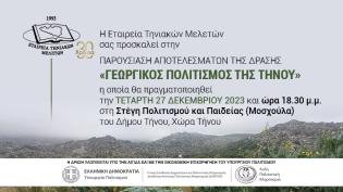 Η Εταιρεία Τηνιακών Μελετών διοργανώνει εκδήλωση με θέμα την ΠΑΡΟΥΣΙΑΣΗ ΑΠΟΤΕΛΕΣΜΑΤΩΝ ΤΗΣ ΔΡΑΣΗΣ «ΓΕΩΡΓΙΚΟΣ ΠΟΛΙΤΙΣΜΟΣ ΤΗΣ ΤΗΝΟΥ» η οποία θα πραγματοπ...