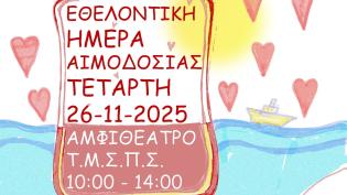 Το Γενικό Νοσοκομείο Σύρου ανακοινώνει ότι την Τετάρτη 10/12/2025 και ώρες 17:00-20:00 θα πραγματοποιηθεί αιμοδοσία, στο Τμήμα Αιμοδοσίας του Νοσοκομε...