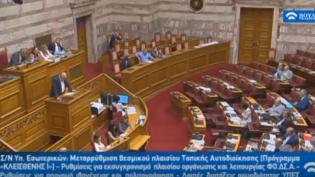 Ως ένα βήμα αναβάθμισης της Τοπικής Αυτοδιοίκησης α’ και β’ βαθμού, με στόχο την ουσιαστική συμμετοχή της κοινωνίας, χαρακτήρισαν από το βήμα της Βουλ...