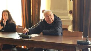 Δηλώσεις του αντιδημάρχου Οικονομικών και υπεύθυνου για τον Αθλητισμό στη Σύρο, Δημήτρη Κοσμά με φόντο το γήπεδο του βόλεϊ και την ενίσχυση του φέροντα οργανισμού