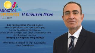 Ο υποψήφιος Δήμαρχος Σύρου – Ερμούπολης, κ. Νίκος Λειβαδάρας και τα μέλη της παράταξης “Ανοιχτοί Ορίζοντες για τη Σύρο”, σας προσκαλούν στην παρουσίασ...