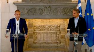 O πρωθυπουργός Κυριάκος Μητσοτάκης και ο πρόεδρος της UEFA, Αλεξάντερ Τσέφεριν πραγματοποίησαν κοινές δηλώσεις, μετά τη συνάντησή τους με τους τέσσερι...