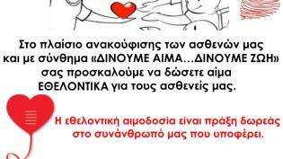 Στο πλαίσιο ανακούφισης των ασθενών μας και με σύνθημα "Δίνουμε αίμα... δίνουμε ζωή" σας προσκαλούμε να δώσετε αίμα εθελοντικά για τους ασθενείς μας. ...