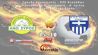 Παρακολουθείστε σε ζωντανή μετάδοση από το γήπεδο της Ερμούπολης – ΕΠΣ Κυκλάδων το αγώνα της Α’ κατηγορίας μεταξύ της Άνω Σύρου και της Ελλάς Σύρου. Τ...