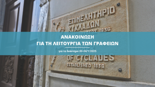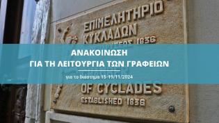 Το Επιμελητήριο Κυκλάδων ενημερώνει τα μέλη του ότι λόγω της εκλογικής διαδικασίας κατά τις ημέρες Παρασκευή 15, Δευτέρα 18 (ημέρα των εκλογών) και Τρ...