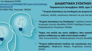 Διαδικτυακή συζήτηση θα πραγματοποιηθεί την Παρασκευή 4/12 στις 19:00 με θέμα: «Ψυχικές διαστάσεις της πανδημίας και ψυχικής ανθεκτικότητα: ενήλικες, ...