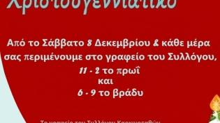 Σας περιμένουμε στο Χριστουγεννιάτικο Bazaar του Συλλόγου μας, καθημερινά, από την Τετάρτη 27 Νοεμβρίου έως και την Κυριακή 8 Δεκεμβρίου και ώρες 11:0...