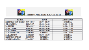 Το ωράριο των καταστημάτων για την περίοδο του Πάσχα, εξέδωσε ο Εμπορικός Σύλλογος Σύρου, για τα μέλη του και προς ενημέρωση των καταναλωτών. Υπενθ...